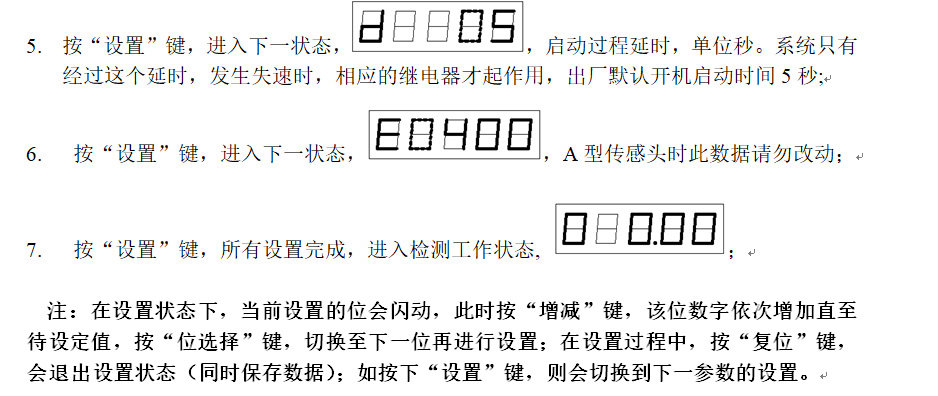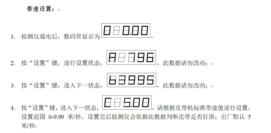 本检测仪的工作过程是皮带机开机后,传感头发出脉冲信号至检测仪控制箱,检测仪经处理器运算并经数码管显示皮带机的带速,同时输出4-20mA带速模拟量信号;当皮带发生打滑,即带速低于正常速度的90%时,检测仪发出轻度打滑报警信号,对应的面板LED轻打滑指示灯亮;带速低于正常速度的80%时,检测仪发出重度打滑报警信号(4组常开常闭),对应的面板LED重打滑指示灯亮。